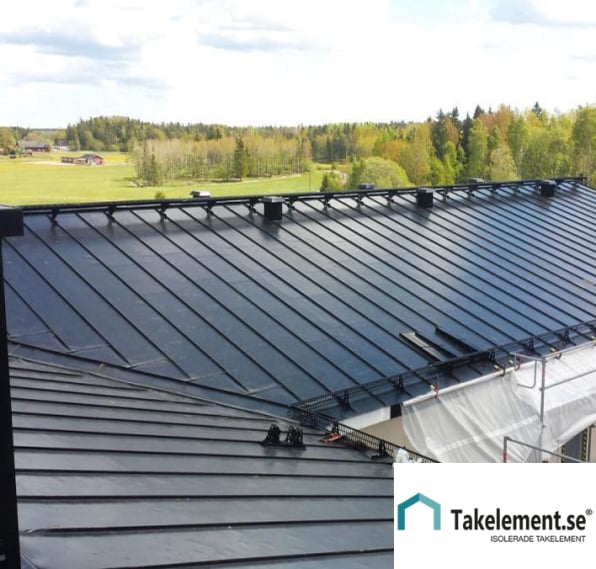 Takelement ger huset ett klassiskt, vackert bandtäckt plåttak i valfri kulör. De isolerade takelementen levereras färdigställda för montering, anpassade för projektet med valda förmonterade taktillbehör.
